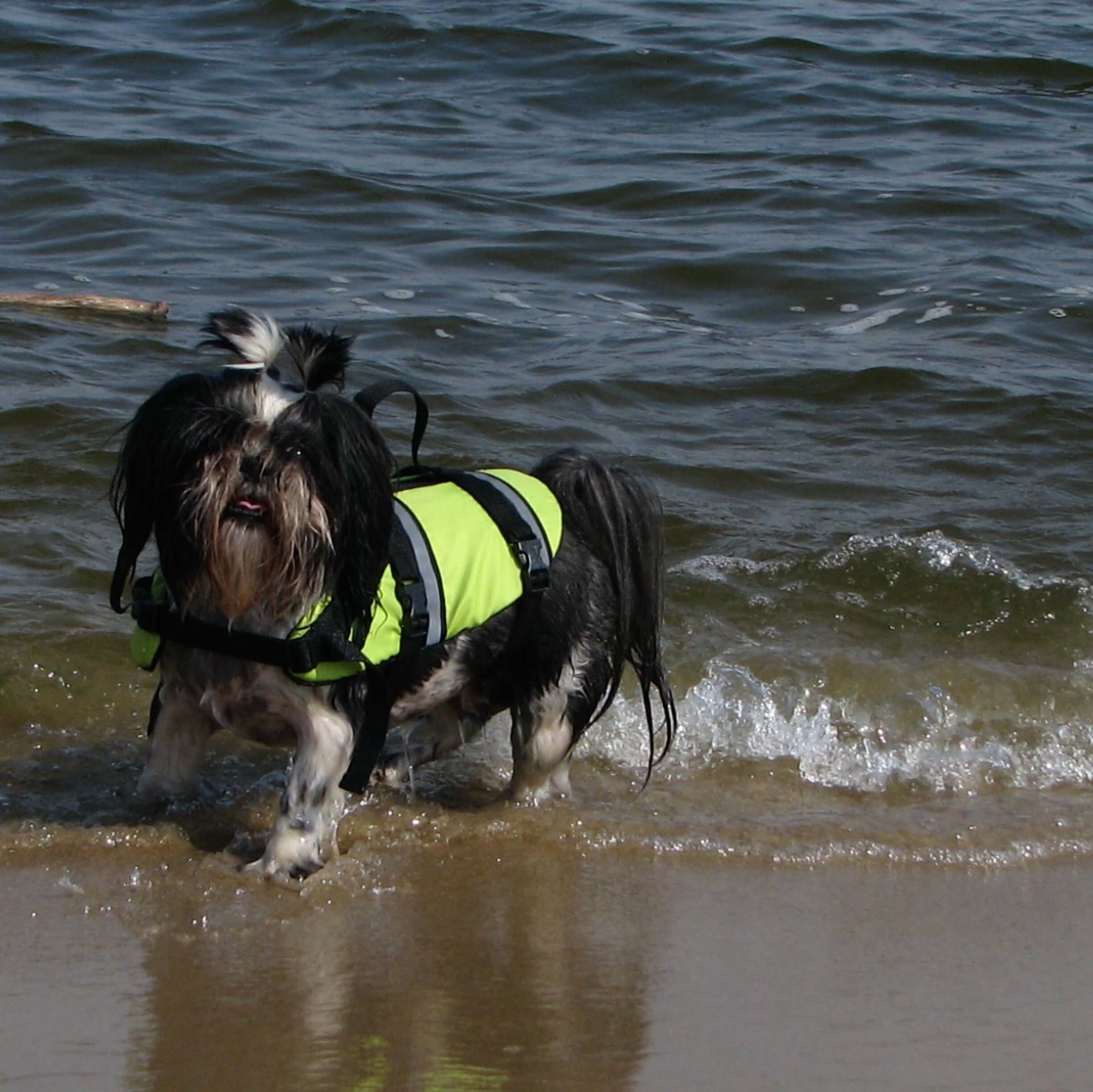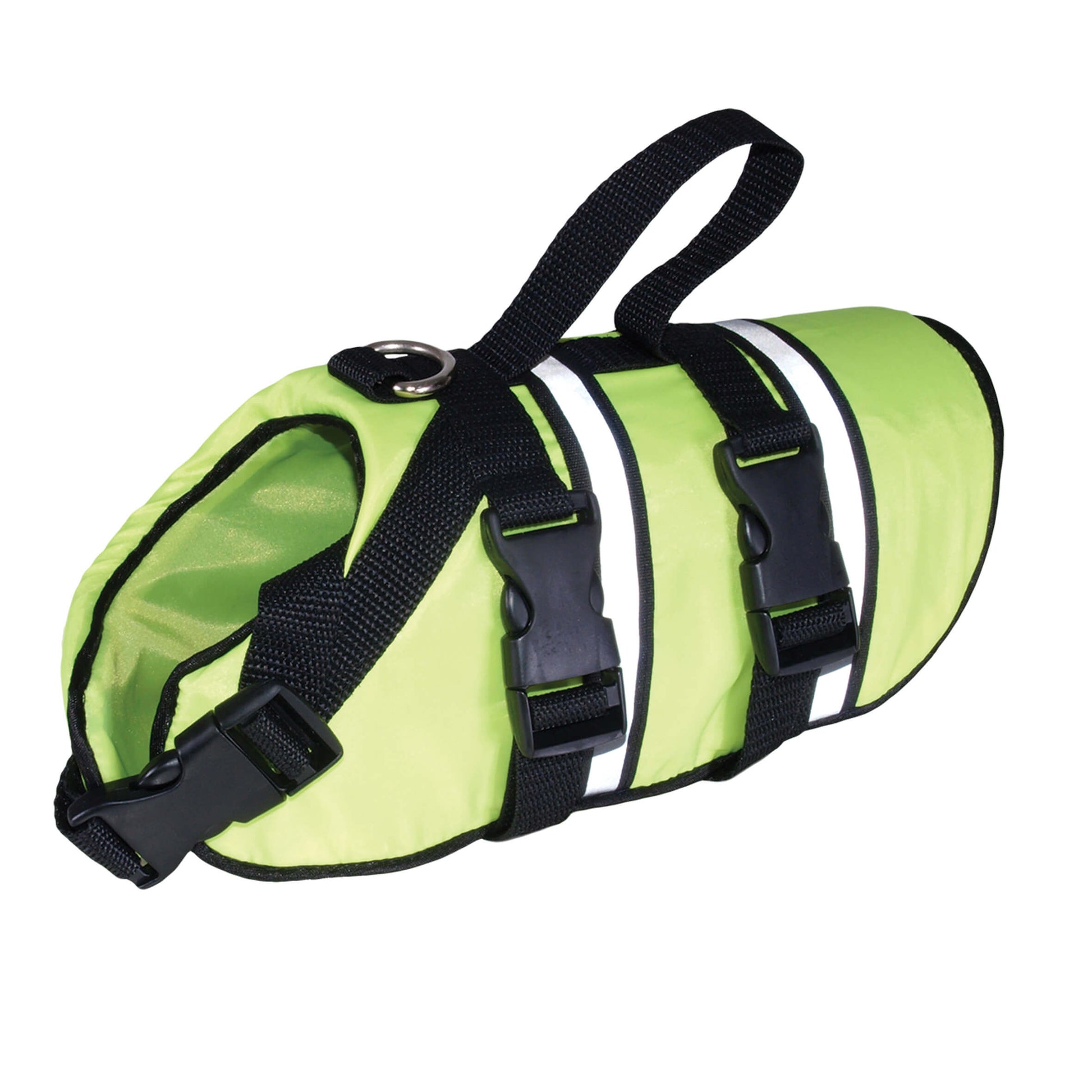 Σωσίβιο σκύλου. Διατίθεται σε φωτεινά, ευδιάκριτα χρώματα. Με ανακλαστικές ρίγες και αγκράφες που εφαρμόζονται με τέτοιο τρόπο ώστε να μην μπλέκονται στο τρίχωμα του σκύλου. Η λαβή στο πίσω μέρος σας επιτρέπει να σηκώσετε το σκύλο σε έκτακτη ανάγκη. Χρησιμοποιείται επίσης για την αποκατάσταση ζώων, ιδιαίτερα σε πισίνες.
