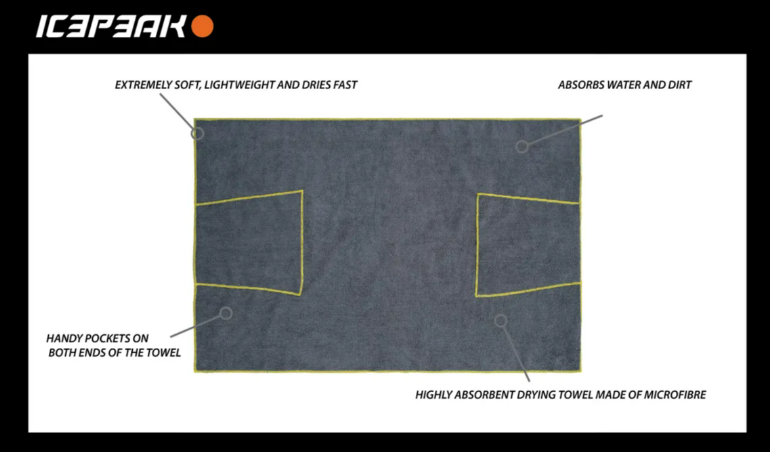 Πρακτική πετσέτα με τσέπες και στις δύο άκρες. Η πετσέτα από μικροΐνες υψηλής ποιότητας απορροφά νερό έως και επτά φορές το βάρος της. Στεγνώνει τον σκύλο πολύ πιο γρήγορα από μια κανονική πετσέτα. Εκτός από το νερό, οι μικροΐνες παγιδεύουν επίσης λάσπη και βρωμιά. Η εξαιρετικά απαλή πετσέτα πλένεται με νερό. Αυτή η ελαφριά πετσέτα συσκευάζεται σε μικρό μέγεθος και είναι εύκολη στη μεταφορά. Η πετσέτα διαθέτει θηλιά για κρέμασμα.